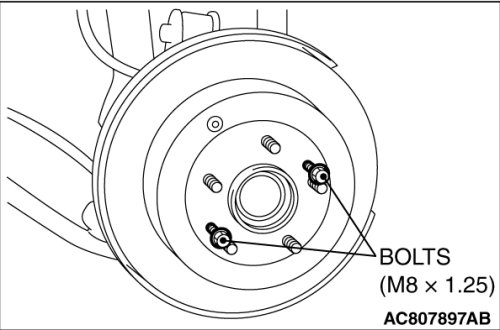 If the brake disc is seized, install M8 x 1.25 bolts as shown, and remove the disc by tightening the bolts evenly and gradually.