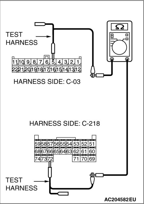 (1)Disconnect joint connector (3) C-03 and ETACS-ECU connector C-218, and measure the resistances at the wiring harness sides of joint connector (3) C-03 and ETACS-ECU connector C-218.