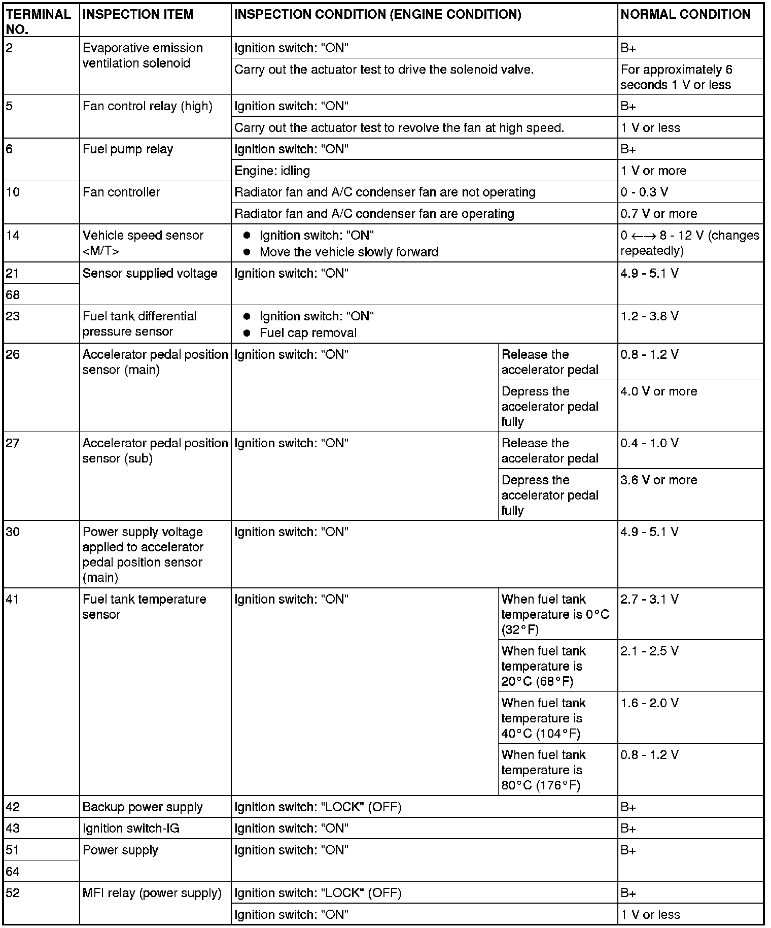 CHECK AT THE ENGINE CONTROL MODULE (ECM) [M/T] OR THE POWERTRAIN CONTROL MODULE (PCM) [A/T]
