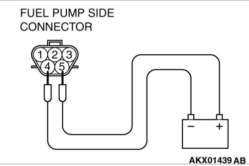 (2)Use jumper wires to connect fuel pump connector terminal No. 5 to the positive battery terminal and terminal No. 4 to the negative battery terminal.