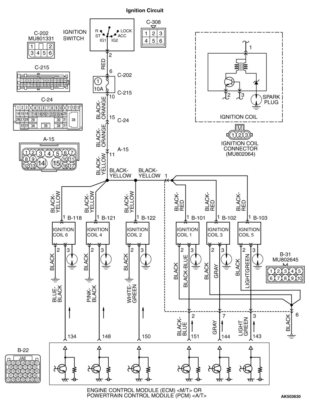 a. Check the harness wire between ignition coil connector B-101 (terminal No. 3) and ECM [M/T] or PCM [A/T] connector B-22 (terminal No. 151) at ignition coil 1.