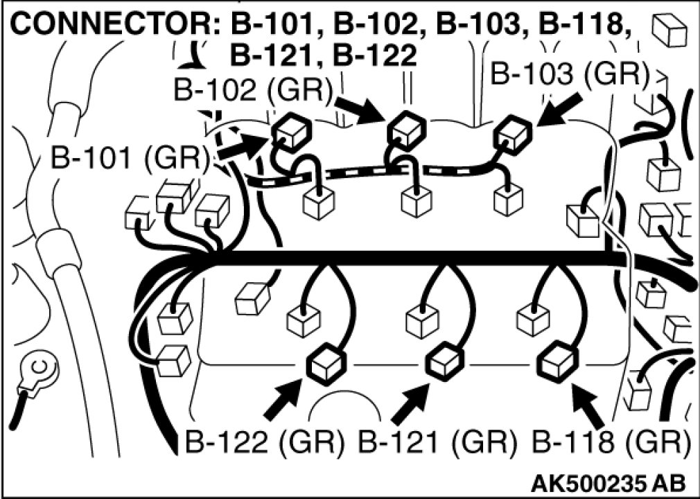 STEP 4. Check the circuit at ignition coil harness side connectors B-101, B-102, B-103, B-118, B-121, B-122.