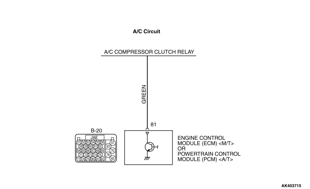 - When the A/C is "ON" the ECM [M/T] or the PCM [A/T] turns "ON" the power transistor in the ECM [M/T] or the PCM [A/T]. The ECM [M/T] or the PCM [A/T] delays A/C engagement momentarily while it increases idle r/min. Then the A/C compressor clutch relay coil will be energized.
