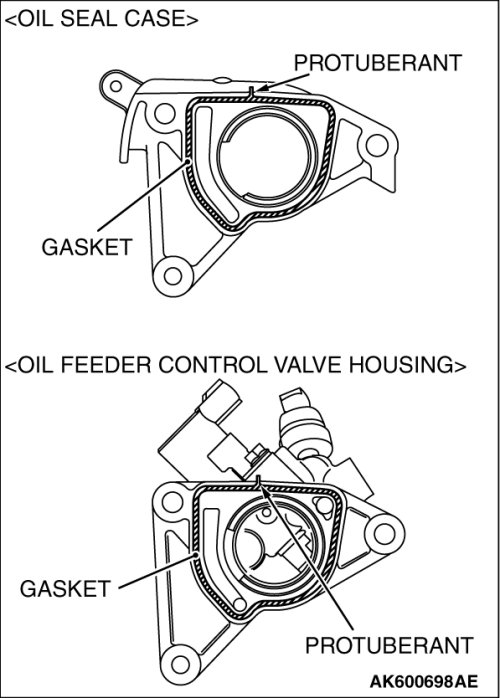 1. Install the oil feeder control valve housing gasket and oil seal case gasket so that the protuberant is positioned as shown in the illustration.