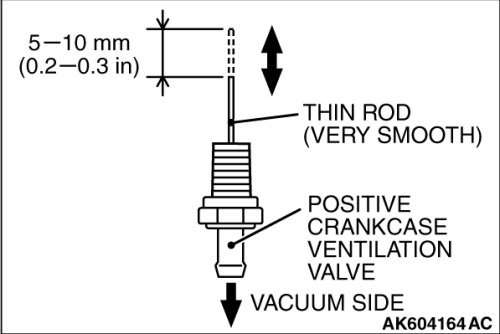 1. Hold the positive crankcase ventilation (PCV) valve with the vacuum side down. Insert a thin rod, and using light pressure, depress the end of the PCV valve spring by 5 - 10 mm (0.2 - 0.3 inch). Release pressure on the rod to see if the PCV valve spring will lift the rod to its original position.