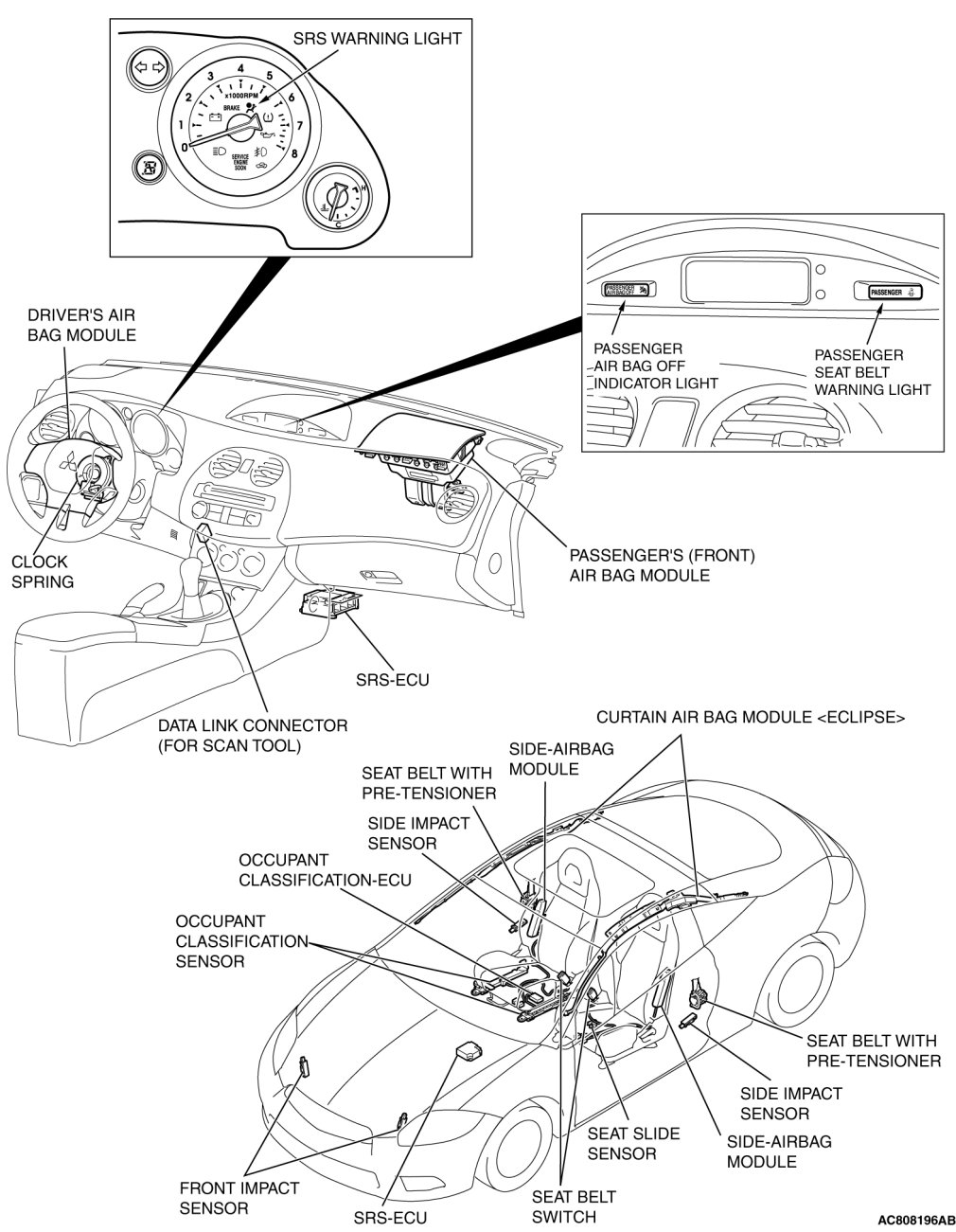 Each air bag consists of a folded air bag and an inflator unit. The SRS-ECU placed on the forefront of the floor monitors the system and has a front air bag safing G-sensor, front air bag analog G-sensor and a side-airbag safing G-sensor. The front impact sensor is assembled in the radiator support panel to monitor impact in case of front impact. The side impact sensors inside the center pillars monitor the shock incurred by the sides of the vehicle. The SRS warning light on the combination meter indicates the operational status of the SRS. The clock spring is installed in the steering column. The seat belt pre-tensioner is built into the driver's and passenger's front seat belt retractor. The seat slide sensor is installed at the seat adjuster section of the driver seat in order to detect the driver seat slide position. The occupant classification sensor is installed underneath a rail of the passenger seat to detect the load on the seat. The passenger air bag OFF indicator light is installed to the lower left of the multi-center display, and illuminates when the passenger seat air bag is inactive. The passenger seat belt warning light is installed to the lower right of the multi-center display, and illuminates when the passenger is not wearing the seat belt. The seat belt switch detects whether the seat belt is used.