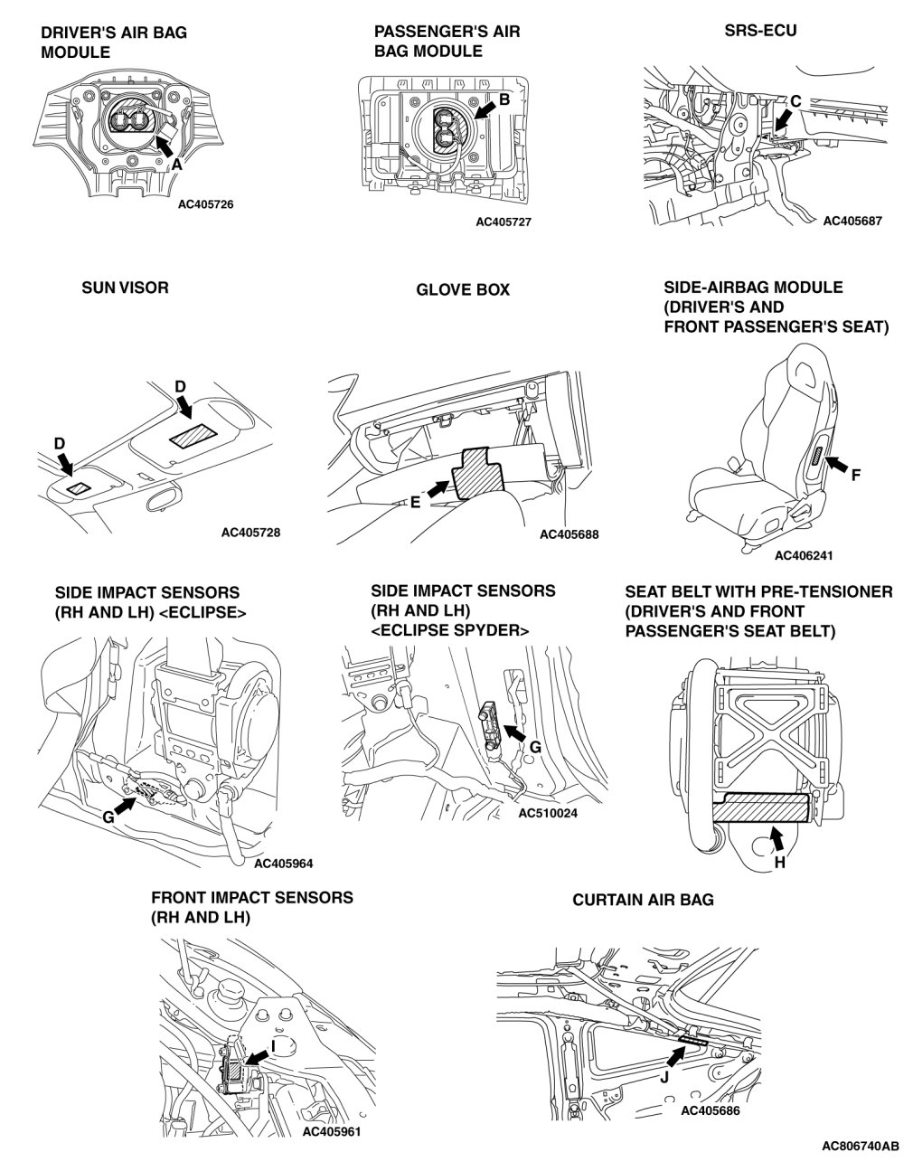 The SRS consists of six air bag modules, SRS air bag control unit (SRS-ECU), two front impact sensors, two side impact sensors, SRS warning light, passenger air bag OFF indicator light, passenger seat belt warning light, clock spring, seat belt pre-tensioner, seat belt switch, seat slide sensor, occupant classification sensor and occupant classification-ECU. Air bag modules are located in the center of the steering wheel and above the glove box. Side-airbags are located inside the front seatback assemblies. The curtain air bag module consists of an air bag, an inflator, and the fixing gear relating to those parts, and is installed in the roof side sections