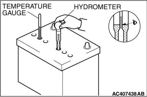 2. Use a hydrometer and temperature gauge to check the specific gravity of the electrolyte.