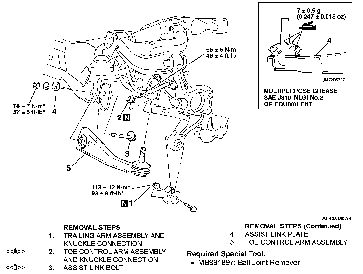 ^ Do not remove the nut from ball joint. Loosen it and use special tool MB991897 to avoid possible damage to ball joint threads.