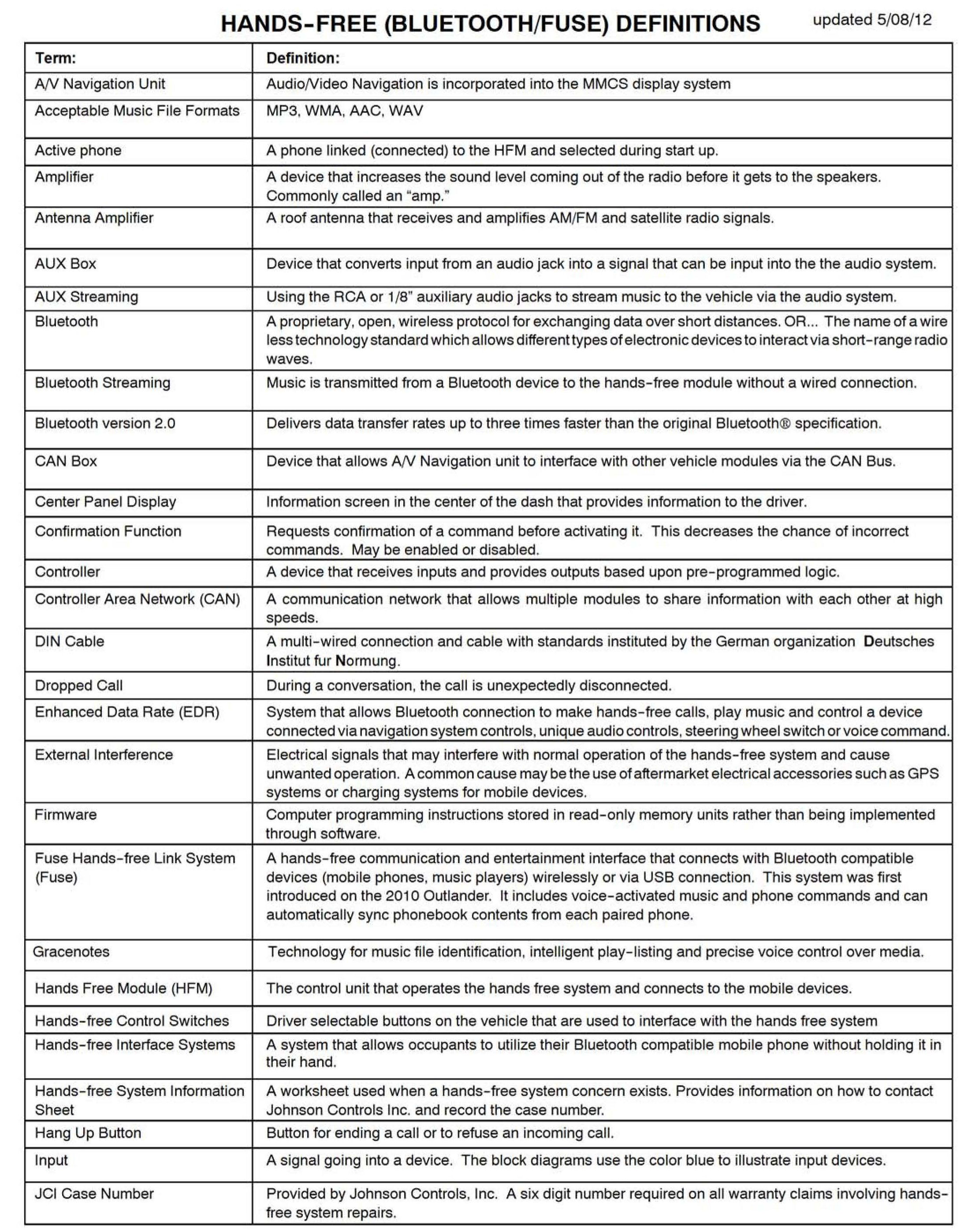 To provide service personnel a single source of information for the hands-free technologies (Bluetooth Hands-free System, Fuse Hands-free Link System) used in Mitsubishi vehicles (except Raider). This TSB provides additional guidance to help you understand, diagnose and repair these systems.