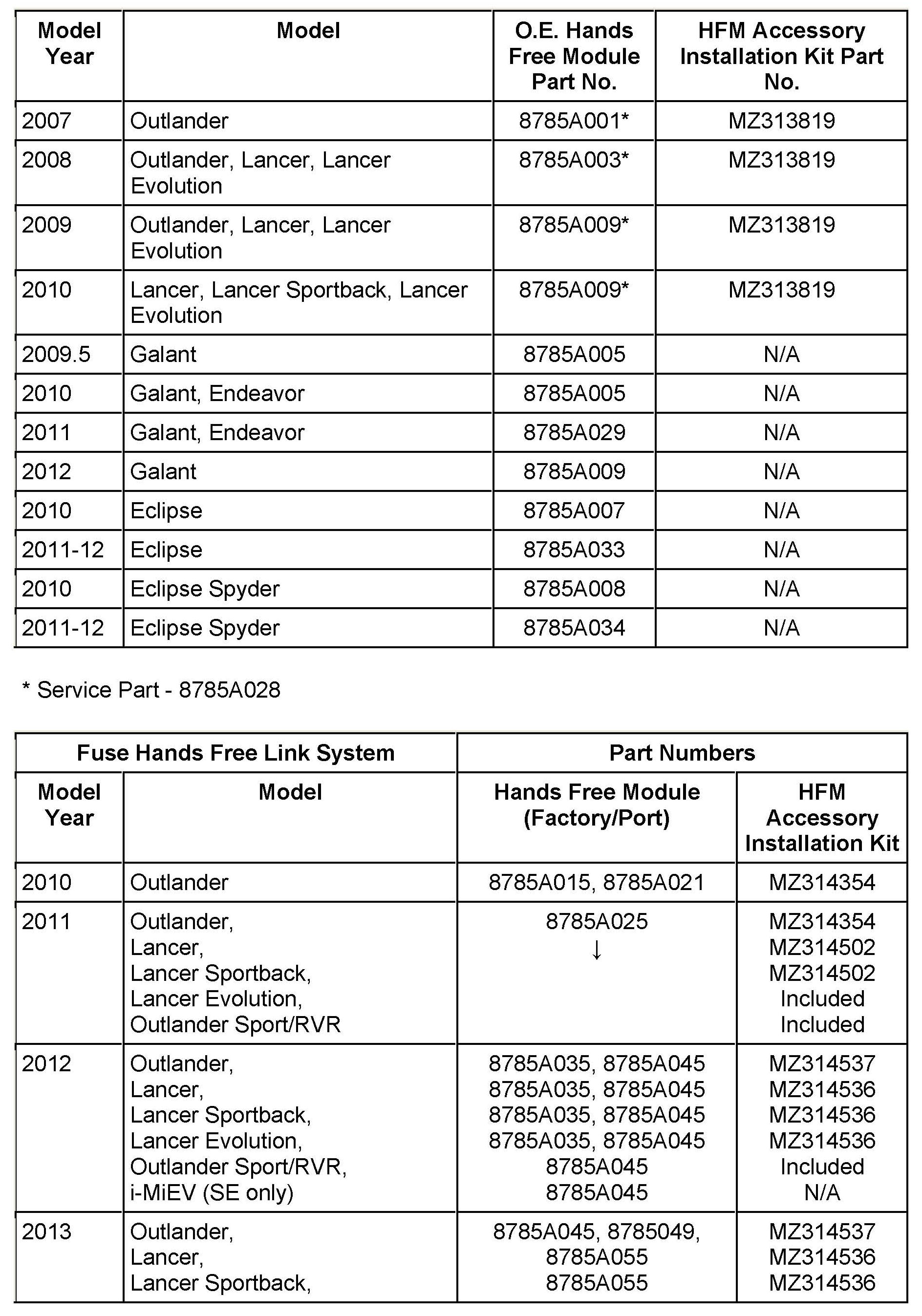 The chart lists vehicle model and year for factory or port installed OEM hands-free modules.