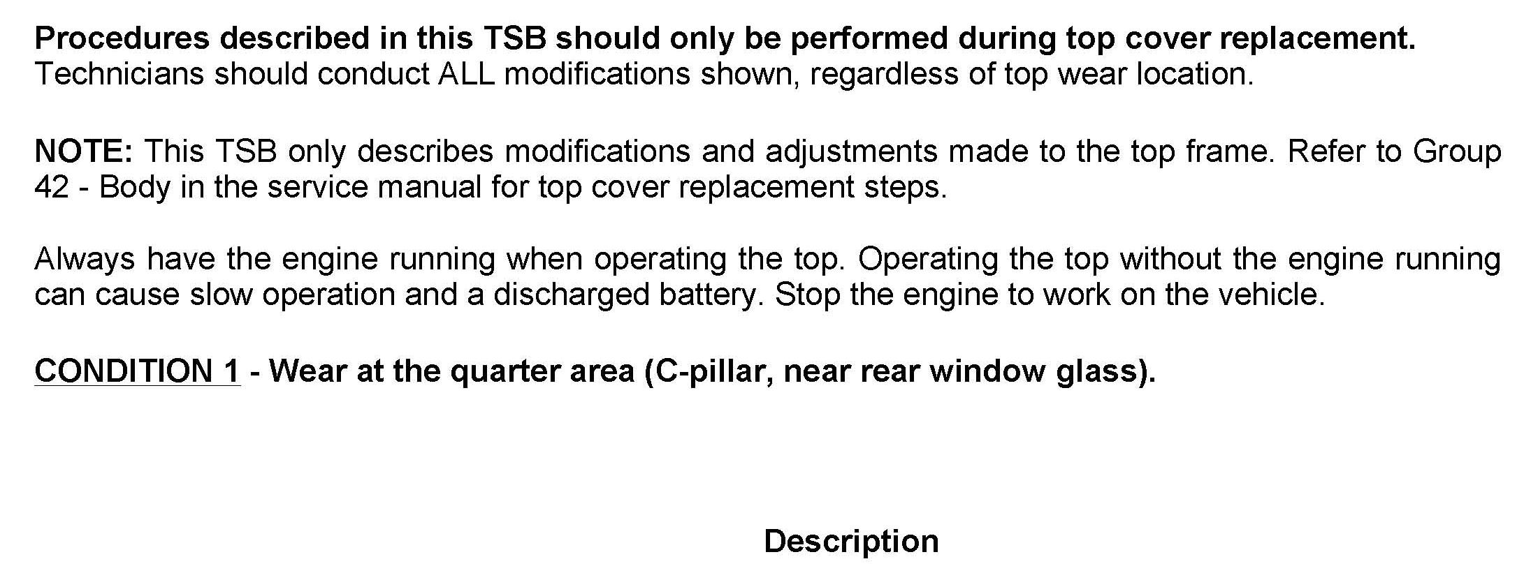 Convertible top covers on some affected vehicles may exhibit wear at points of contact with the top frame. This occurs when sections of the stowed top rub against each other as the vehicle is driven or when the top is in operation. Wear usually occurs in the following areas: