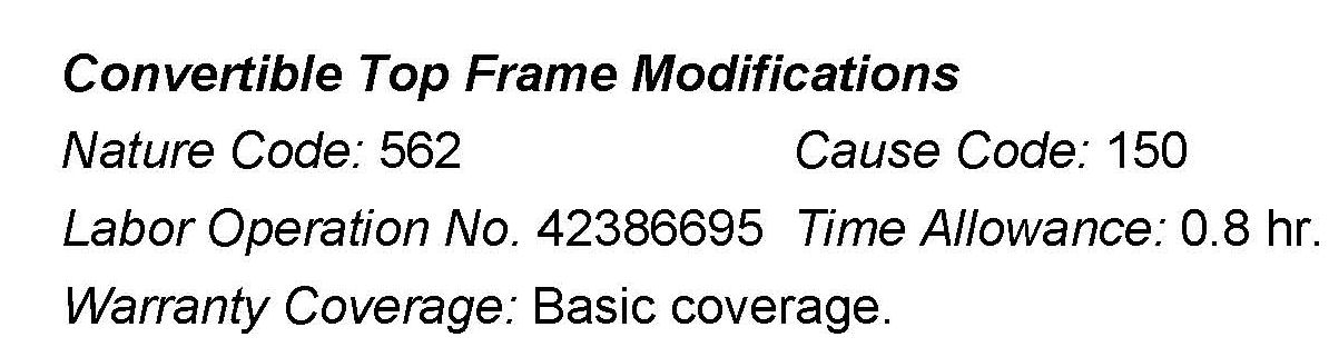 This bulletin is supplied as technical information only and is not an authorization to repair. Repairs should only be made in conjunction with a convertible to cover replacement. If an affected vehicle is observed with the described condition diagnose the condition repair as described in this bulletin and submit a normal warranty claim using the following information.
