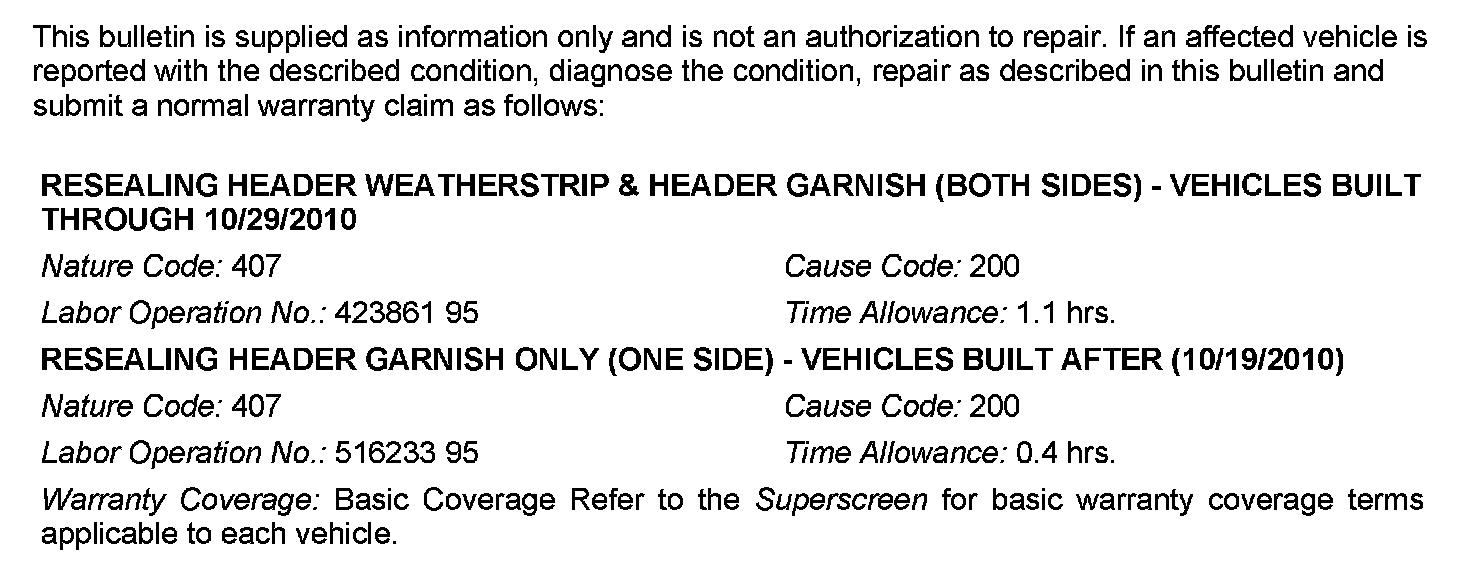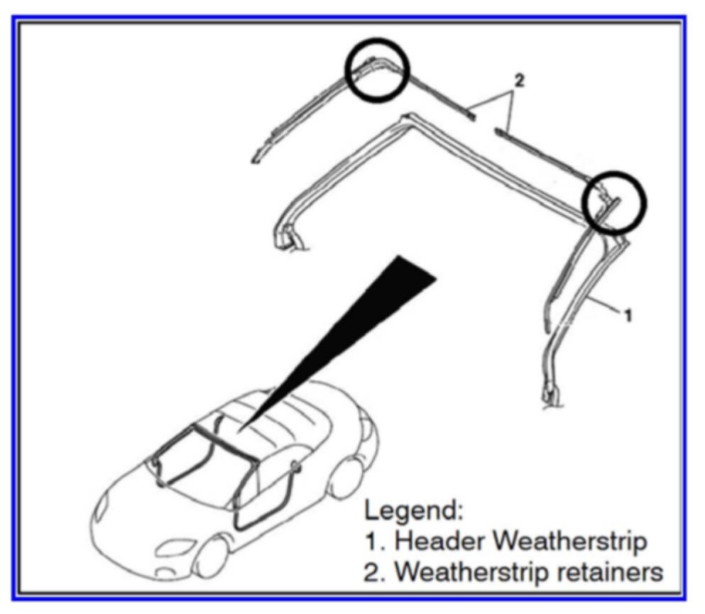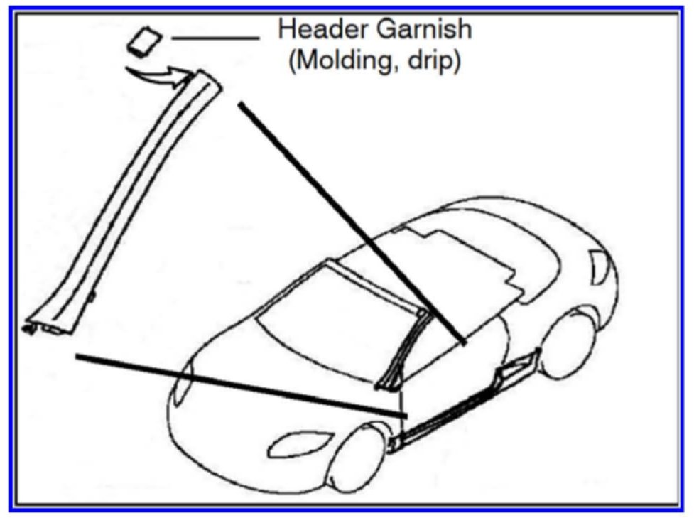 1. Use the Water Leak Check procedures (e.g. hose size and water flow) shown in Section 42 - Body of the service manual to confirm a water leak exists at one of top the corners of the weatherstrip. If confirmed on a vehicle built through 10/19/2010, perform BOTH of the following repairs. For newer vehicles, reseal the header header garnish only. If the weatherstrip is damaged (cut, torn, etc.) replace it regardless of the production date.