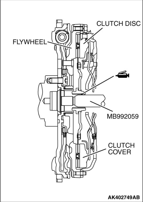 2. Using special tool MB992059 to position the clutch disc on the flywheel.