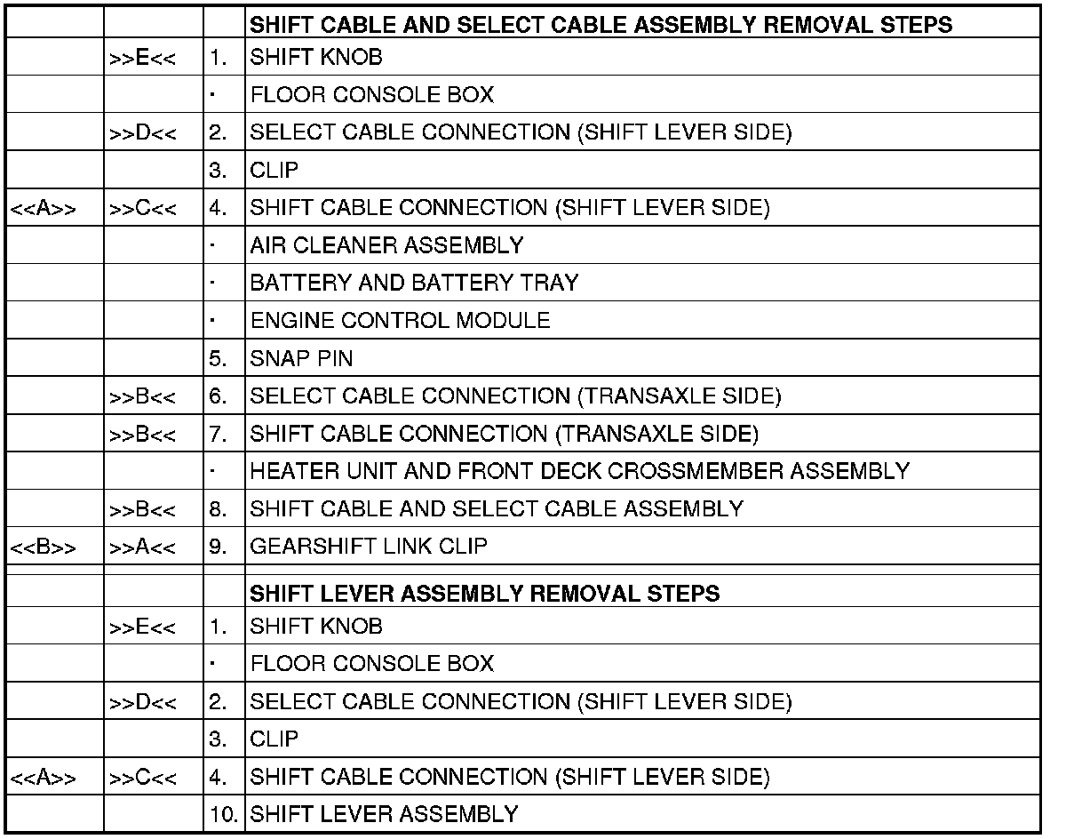 ]]B[[ SHIFT CABLE AND SELECT CABLE ASSEMBLY/SHIFT CABLE CONNECTION (TRANSAXLE SIDE)/SELECT CABLE CONNECTION (TRANSAXLE SIDE) INSTALLATION