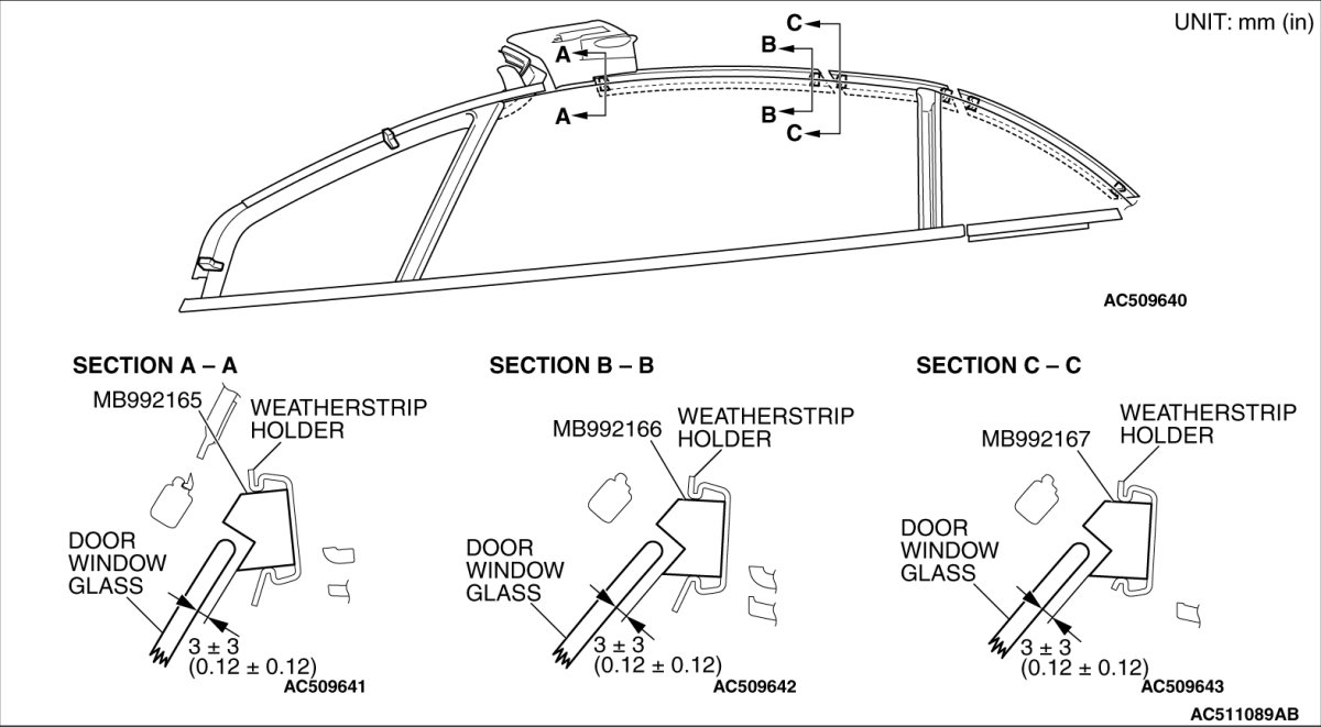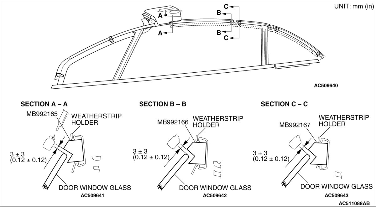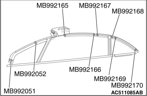 7. Install special tool MB992164 beside the mounting hole of the weatherstrip holder.