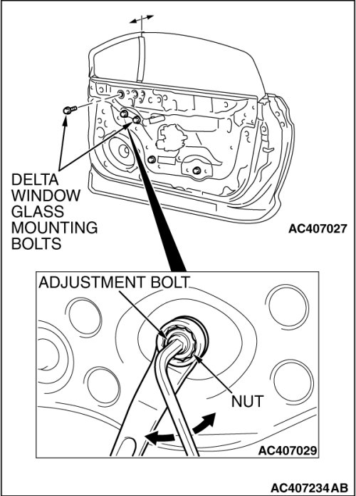 9. Adjust the position of the delta window glass in the fore/aft direction and the vertical direction.