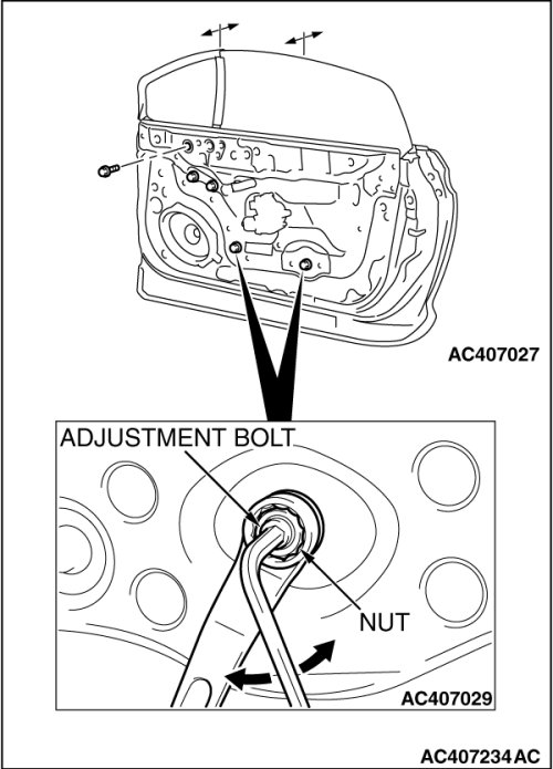 (2) Turn the adjustment bolt. The tilting direction of the door window glass is altered by approximately 1 mm (0.04 inch) when turning the adjustment bolt one rotation.