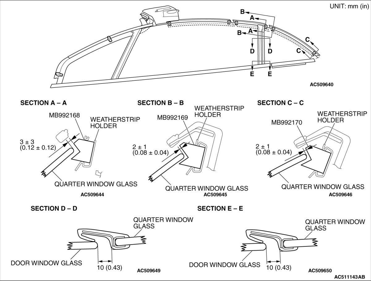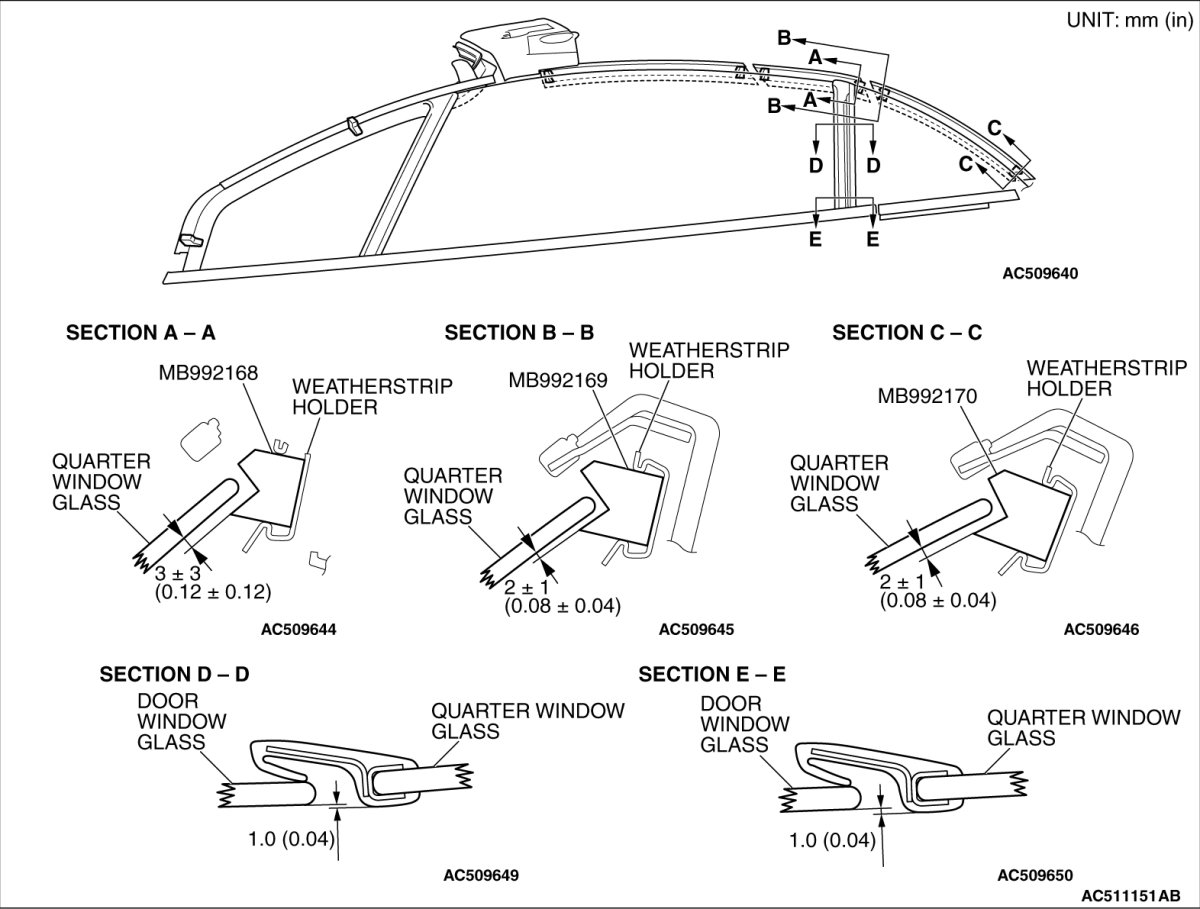 Adjust the quarter window glass to the position shown by moving them in the fore/aft direction the vertical direction.