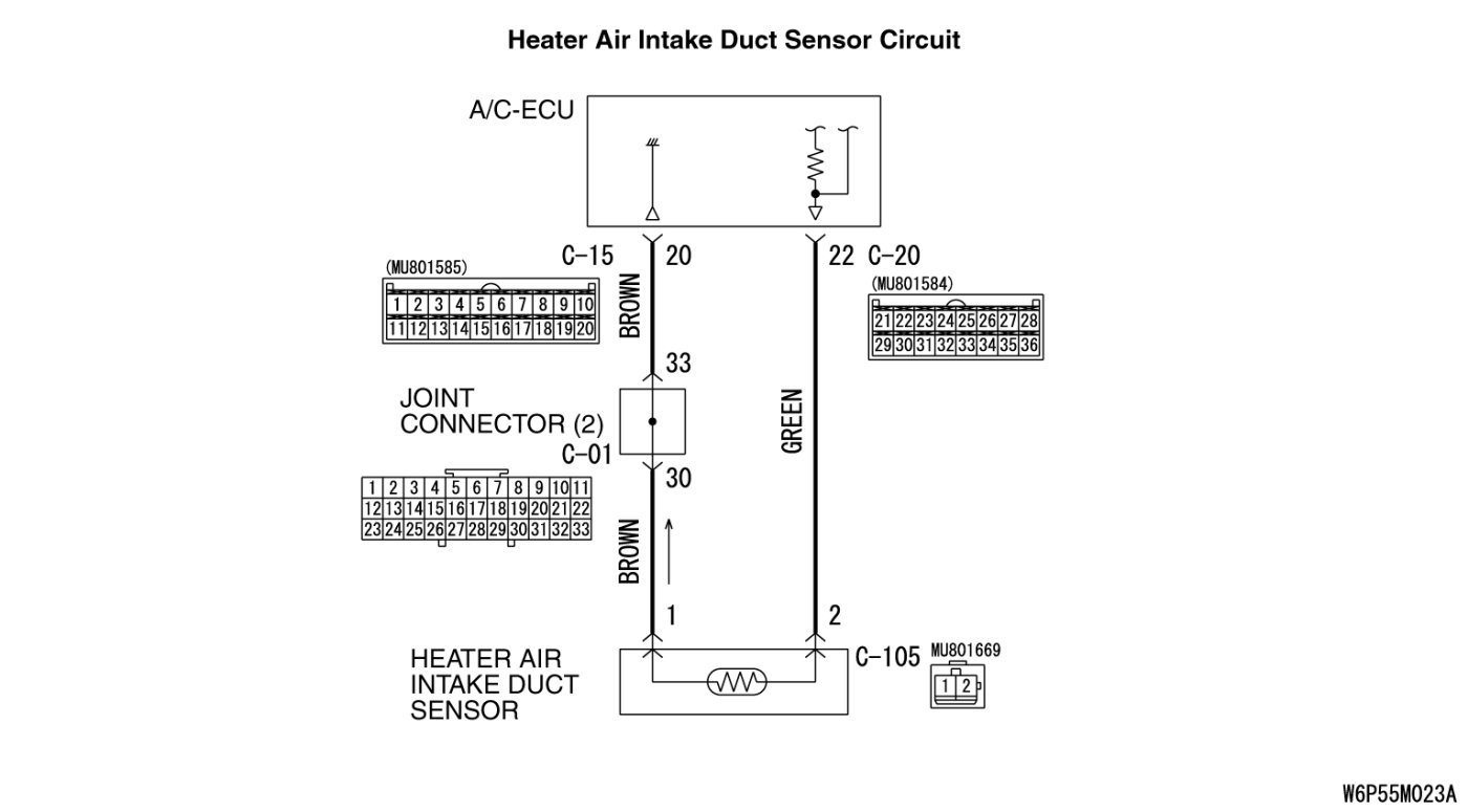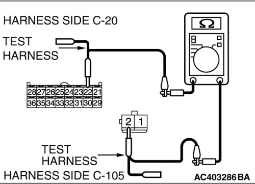 (1)Disconnect A/C-ECU connector C-20 and heater air intake duct sensor connector C-105, and measure the resistance at the wiring harness side.