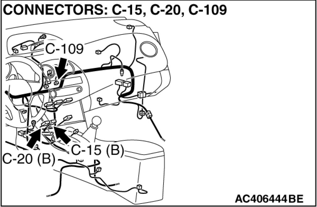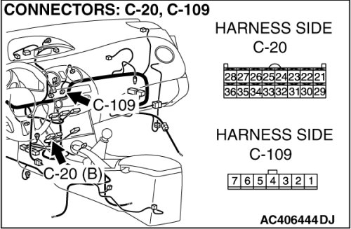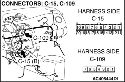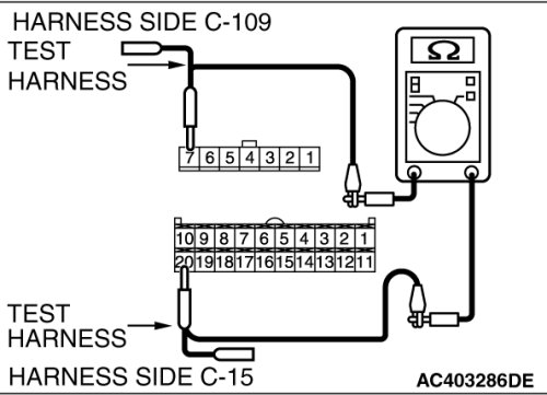 STEP 7. Check the wiring harness between A/C-ECU connector C-15 (terminal 20) and air mixing damper control motor and potentiometer connector C-109 (terminal 7).