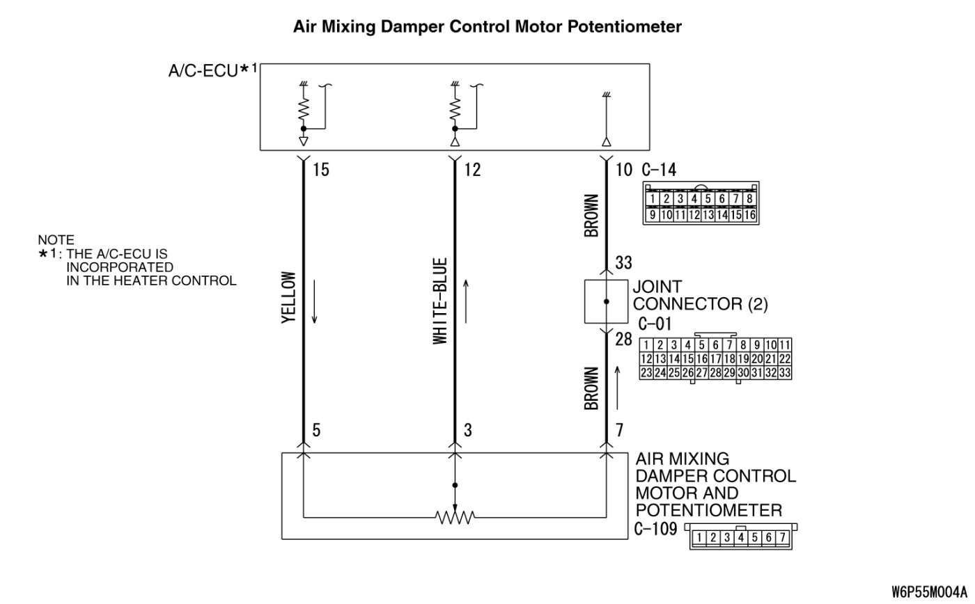 - Malfunction of the harness (air mixing damper control motor and potentiometer circuit is open/shorted to its power supply)