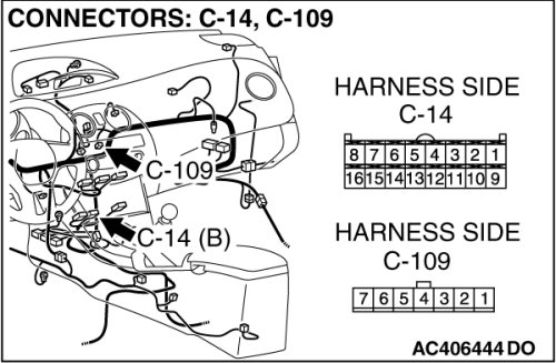 (1)Disconnect A/C-ECU connector C-14 and air mixing damper control motor and potentiometer connector C-109, and measure the resistance at the wiring harness side.