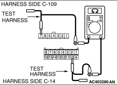 STEP 7. Check the wiring harness between A/C-ECU connector C-14 (terminal 10) and air mixing damper control motor and potentiometer connector C-109 (terminal 7).