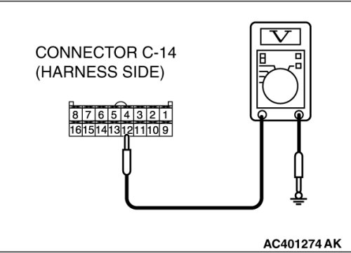 (1)Disconnect A/C-ECU connector C-14, and measure the voltage at the wiring harness side.