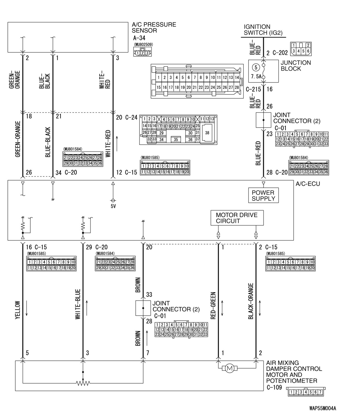 - Malfunction of the harness (open circuit, damage or short to ground of air mixing damper control motor and potentiometer circuit, short to ground of pressure sensor circuit, and open circuit or damage of power supply (IG2) circuit)