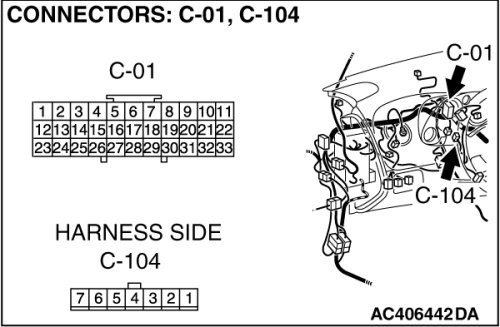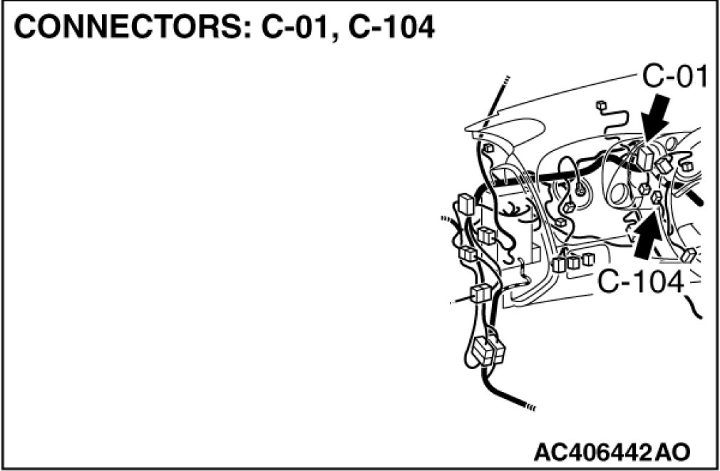 STEP 3. Check A/C-ECU connector C-15 and mode selection damper control motor and potentiometer connector C-104 for loose, corroded or damaged terminals, or terminals pushed back in the connector.