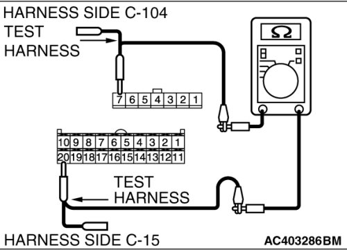 STEP 5. Check the wiring harness between A/C-ECU connector C-15 (terminal 20) and mode selection damper control motor and potentiometer connector C-104 (terminal 7).