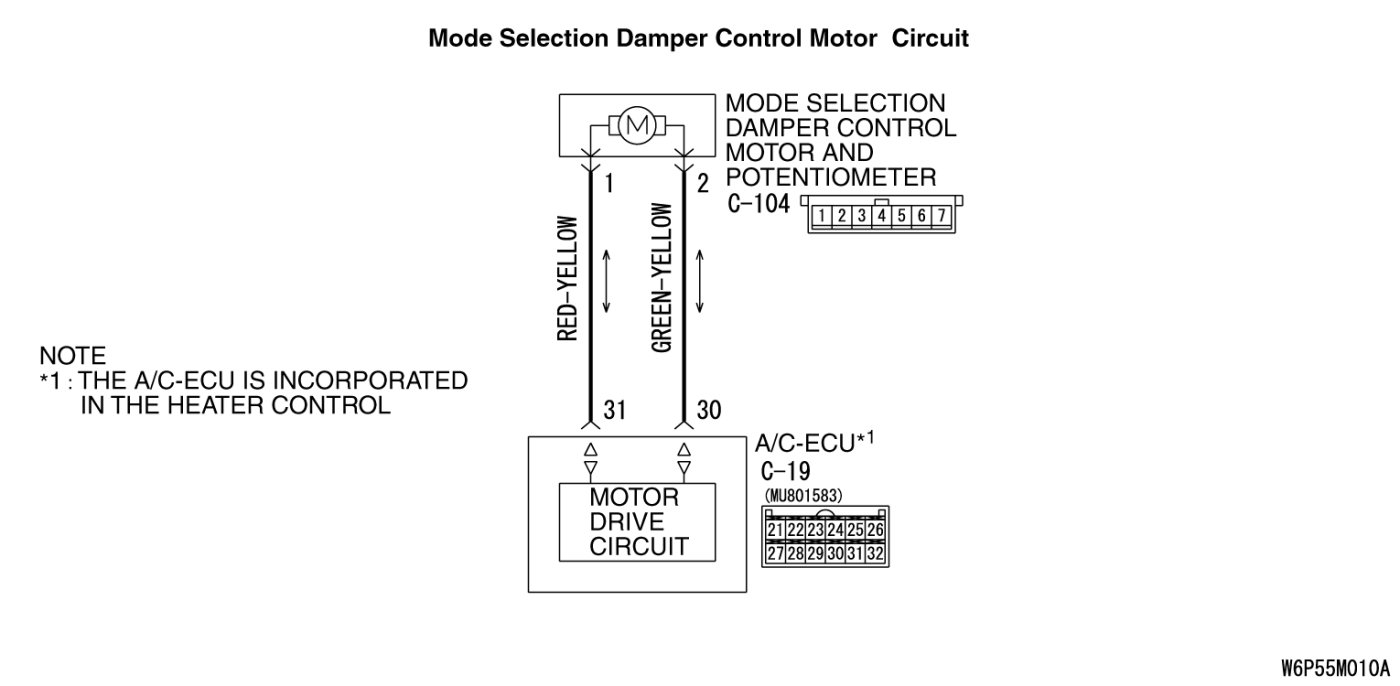 - Malfunction of the harness (mode selection damper control motor and potentiometer circuit is open, shorted to ground, or the resistance has increased)