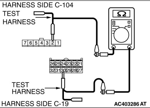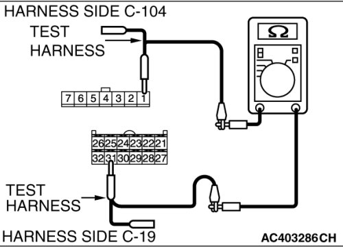 (1)Disconnect A/C-ECU connector C-19 and mode selection damper control motor and potentiometer connector C-104, and measure the resistance at the wiring harness side.