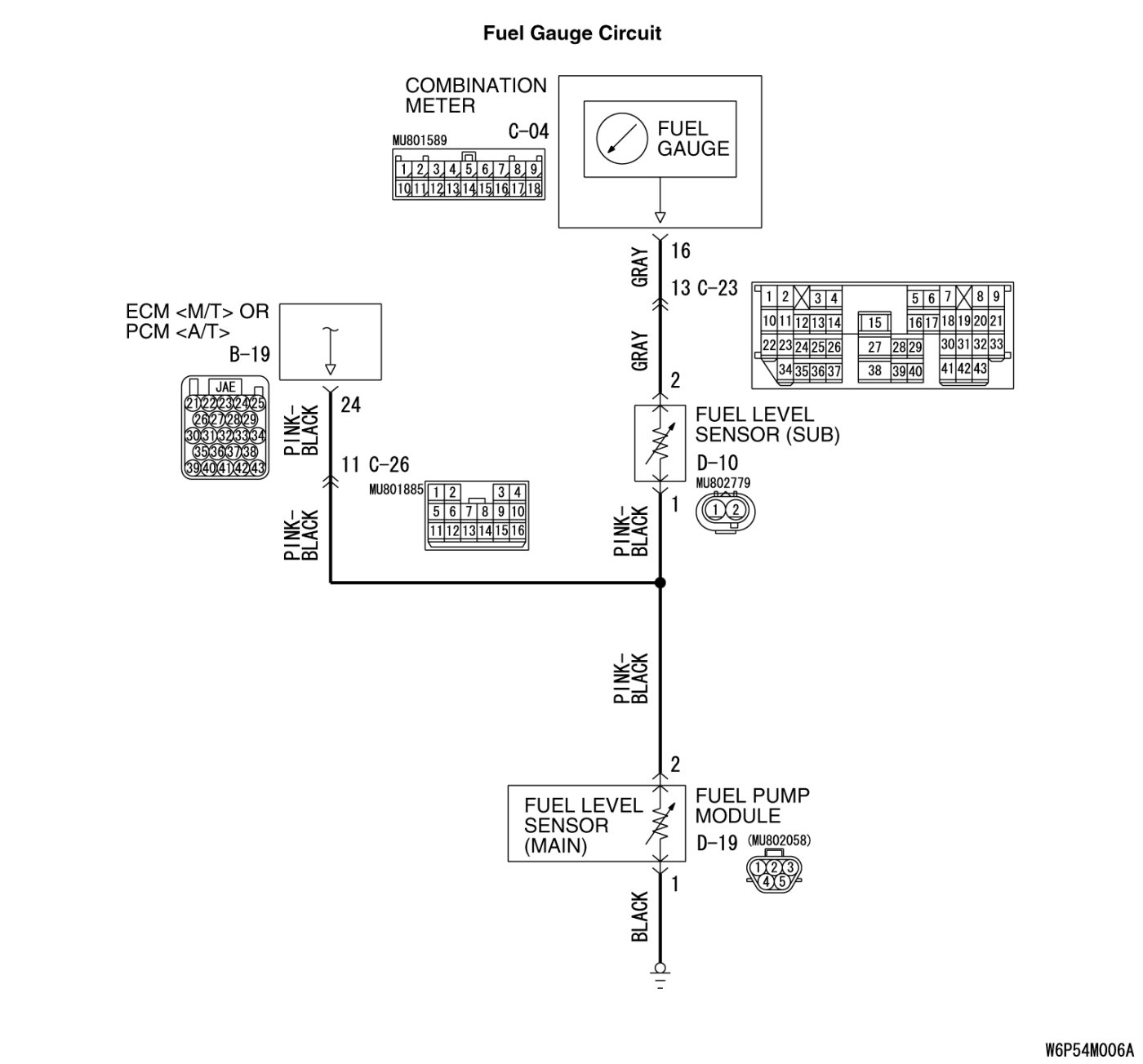 STEP 16. Check the wiring harness between fuel level sensor (sub) connector D-10 (terminal 1) and ECM [M/T] or PCM [A/T] connector B-19 (terminal 24).