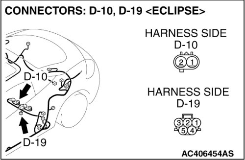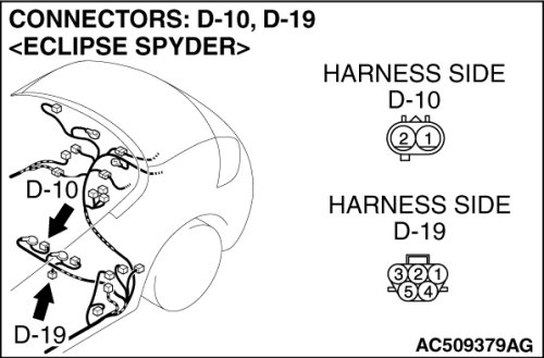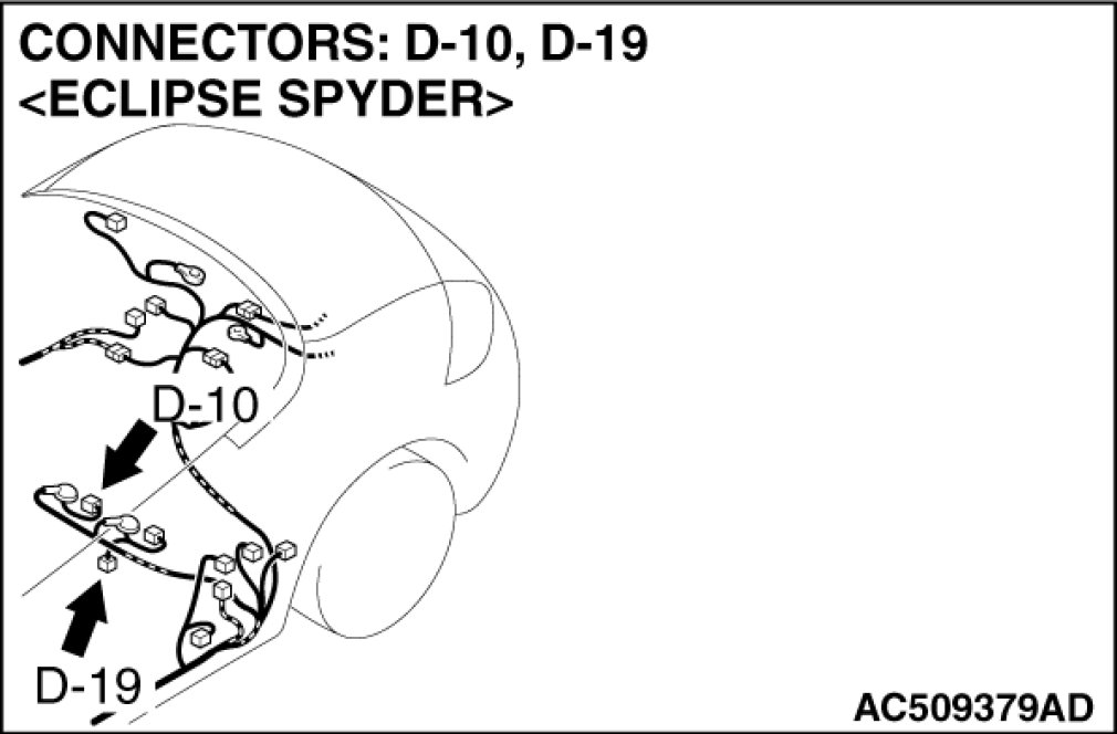(1)Disconnect fuel level sensor (sub) connector D-10, fuel pump module connector D-19 and ECM [M/T] or PCM [A/T] connector B-19, and measure the resistance available at the harness side of the fuel level sensor (sub) connector D-10.