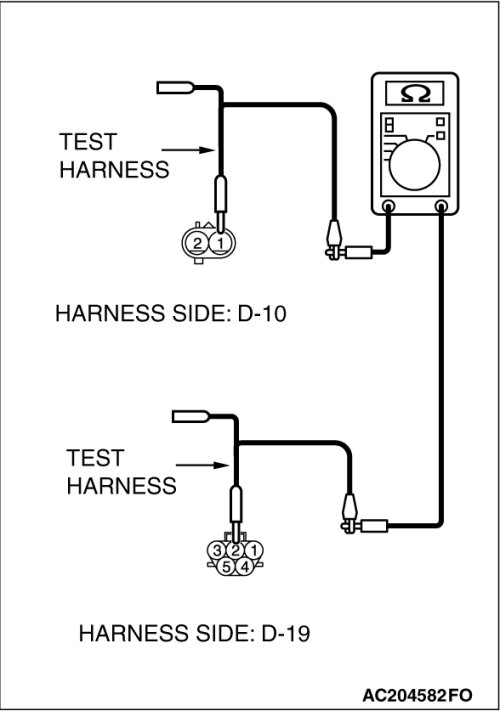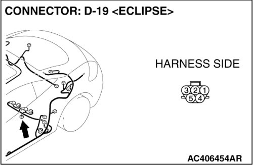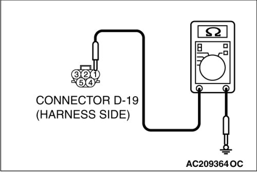 (1)Disconnect fuel pump module connector D-19 and measure the resistance available at the harness side of the connector.