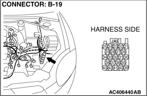 STEP 10. Check combination meter connector C-04 and ECM [M/T] or PCM [A/T] connector B-19 for loose, corroded or damaged terminals, or terminals pushed back in the connector.