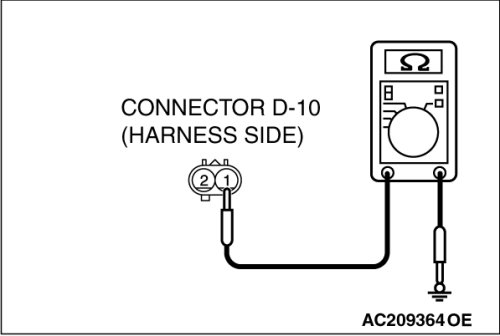 STEP 14. Check the wiring harness between fuel level sensor (sub), the fuel pump module and the ECM [M/T] or PCM [A/T] for short to ground. Measure the resistance at fuel level sensor (sub) connector D-10.