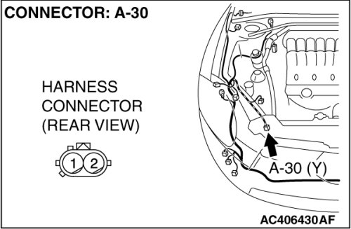 STEP 4. Check the harness wires for open circuit or short circuit between SRS-ECU connector C-123 (terminal No.47 and 48) and front impact sensor (RH) connector A-30 (terminal No.2 and 1).