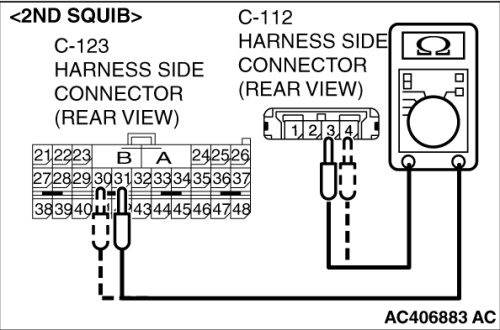 Insert special tool MB991866 into the harness side connector C-112 (terminal No.1 and 2 [1st squib] or terminal No.3 and 4 [2nd squib]) by backprobing.