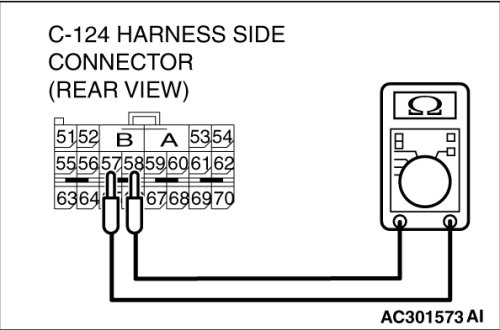 Check for continuity between C-124 harness side connector terminals 57 and 58.