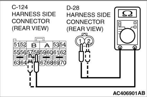 STEP 4. Check the harness for open circuit between SRS-ECU connector C-124 (terminal No.57 and 58) and the side-airbag module (RH) connector D-28 (terminal No.2 and 1).