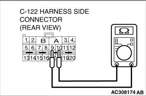 Check for continuity between C-122 harness side connector terminals 9 and 10.