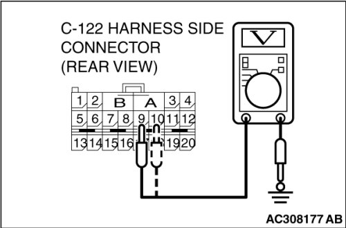Measure the voltage between C-122 harness side connector terminals 9, 10 and body ground.