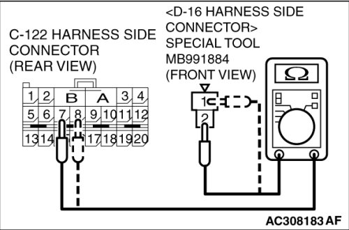 (4)Connect special tool MB991884 to the D-16 harness side connector.
