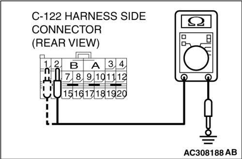 Check for continuity between C-122 harness side connector terminals 1, 2 and body ground.