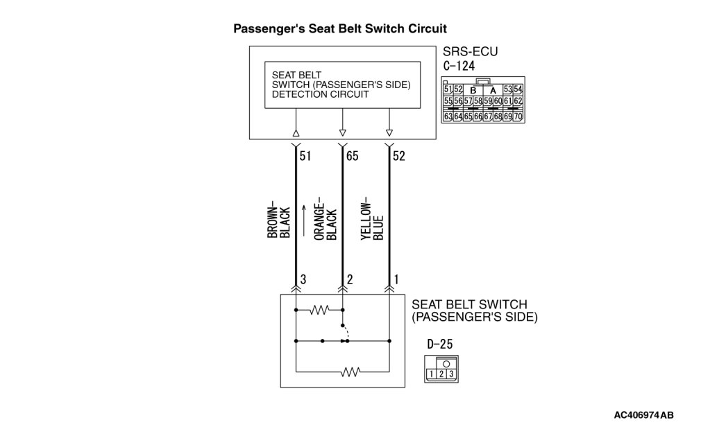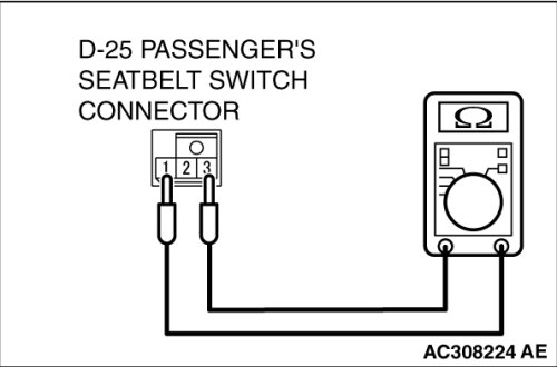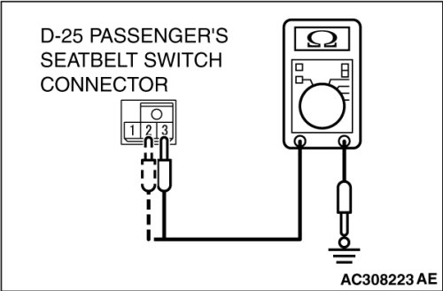 - Check continuity between the passenger's seat belt switch connector D-25 terminals.