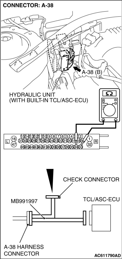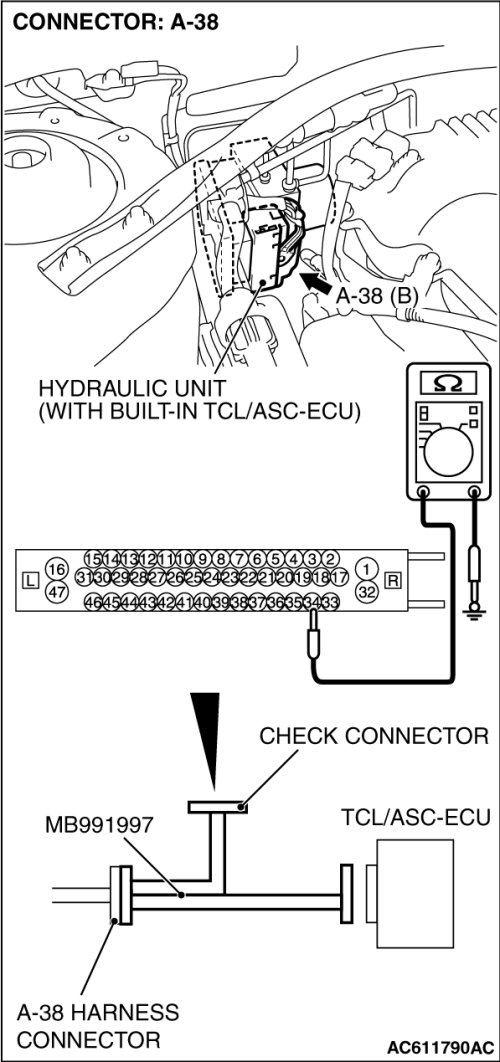 STEP 9. Measure the resistance at TCL/ASC-ECU connector A-38.